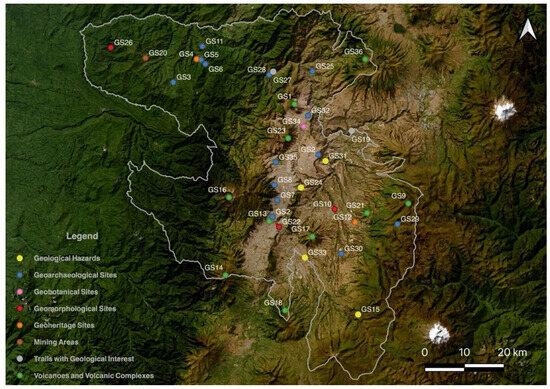 An inventory of different sites of cultural, touristic, or geological interest may be based on the diversity of each case. Therefore, we determined to divide the encountered geosites of the DMQ into ten different groups, which may even overlap. For example, within a volcanic complex, there may be geoheritage sites as well as interesting geological trails. In this respect, we considered the following interesting sites: (1) volcanoes, (2) geological hazards, (3) geoarchaeological sites, (4) geobotanical sites, (5) mining areas, (6) geoheritage sites, (7) geomorphological sites or landscapes, (8) trails of geological interest, and (9) paleontological and (10) speleological sites.