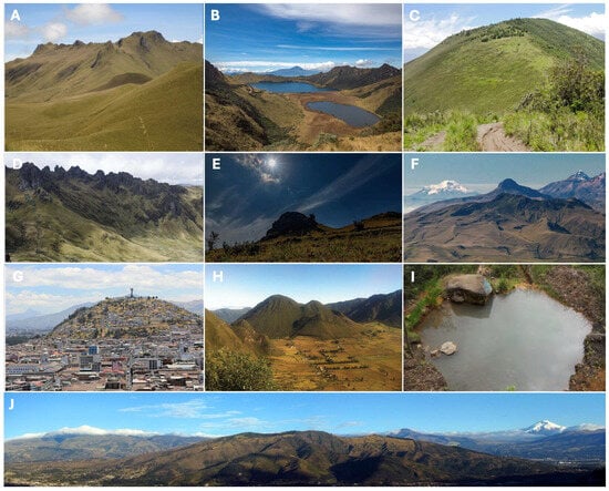 Volcanoes and volcanic complexes of the DMQ, such as Pasochoa ((A); credit Cal240Sr), Mojanda ((B); credit Patricio Loza Trujillo), Casitagua ((C); credit Ecuventure), Puntas ((D); credit Angie Drake), Cotourcu ((E); credit Quito Informa), Atacazo and Niñahuilca ((F); credit Municipality of Mejia), Panecillo (G), Pululahua caldera and inner domes (H), jacuzzi of the Incas in Pululahua (I) and Ilalo ((J); credit Fernando Ron).
