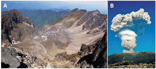 The Cristal volcanic dome complex gave rise to the repeated growth and collapse of volcanic domes, which occurred in the period from 1998 to 2001, of which four prominent eruptions took place (between 5 and 7 October, 26 November, and 10 December 1999). Although continuous monitoring is given, all of those four major eruptions took place within the yellow alert status. The most remarkable eruption occurred on the morning of 7 October 1999, when, in the presence of a clear sky, an almost 15 km high mushroom-shaped eruptive column appeared as a result of a vulcanian to sub-plinian explosion [145]. Currently, there are active fumaroles inside the Cristal volcanic dome complex and various thermal springs, also of touristic use, such as those of Lloa (Figure 6A,B).