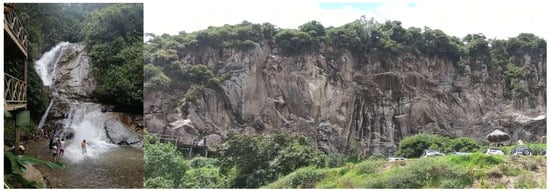 The 1.2 Ma old extinct and highly eroded Ilalo stratovolcano (GS17) stands out in the flat platform of the Valle de los Chillos, in the southernmost area of the DMQ, within the Interandean Valley [106,115]. The stratovolcano is composed mainly of agglomerated lavas and pyroclastic-density currents [125]. Its surface is highly forested and predominantly covered by Cangahua [126]. In its surroundings appear several younger cryptodomes, which are the reason and origin of various thermal springs on its foothills and hereby also allow for a high geothermal energy potential and fog water collection [127,128]. The Ilalo volcano is crosscut by a prominent NE–SW-striking geological fault and has a very characteristic, prominent collapsed sector open to the west. On its foothills appear strong deposits of many previous lahar flows of the Cotopaxi volcano [120,129,130]. There are ten bigger thermal springs sites visited by a high amount of mainly local tourists, of which the most frequented within the DMQ is the Balneario Cununyacu (Figure 5J).