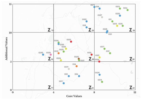 Subsequently, the main values and additional values are contrasted within a matrix of X and Y; this contraposition presents results which are based on the technique of reducing variables. To visualize within the matrix, the form of grouping summarizes three basic categories that define levels, being the upper, lower, and averages of each geosite. Hereby, the X axis is divided into four units, while the core values include twelve sub-indicators, and for the Y axis, it is divided into five units, while additional values include fifteen sub-indicators. Finally, we determined that the matrix includes nine very well-marked zones, of which, each of the thirty-six geosites will be located based on the rating received for each category. The results presented in the obtained matrix expose the graph in relation to both the core and additional values, exposing the quantified data of each geosite. With this, it is feasible to determine the importance and significance of each one of them, which subsequently are located within a coordinate in the matrix.