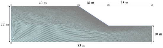 This study considered two finite slopes with 1.5H:1V (SR1) and 2H:1V (SR2) slope ratios and 12 m height. The geometry and sample finite element mesh that will be discussed later for SR1 is shown in Figure 2. The slopes were assumed to be made of sandy soil with a mean friction angle of 30° and zero cohesion. Based on the literature [15], a 10% COV was assumed for the friction angle of the soil. This resulted in a standard deviation of 3° and the friction angle varies between 27° and 33° for ±1 standard deviation. Although ±3 standard deviation is typically used to cover the possible variation, ±1 standard deviation was used to avoid unrealistic geometric and soil combinations that may cause numerical instability during coupled flow–deformation finite element simulations. For example, the slope with a lower friction angle may not be stable enough to perform any finite element calculation. Although some cases would produce results, they may not produce symmetric data.