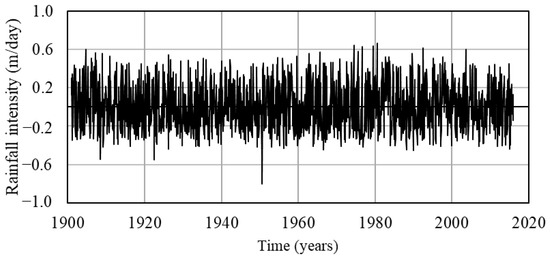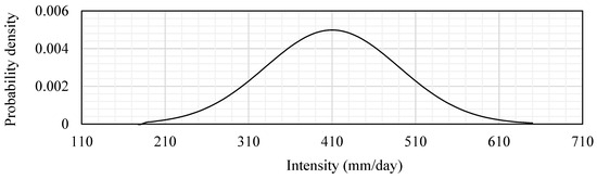 Based on the data, the mean and standard deviation of the rainfall intensities were 410 mm/day and 80 mm/day, respectively. The ±1 standard deviation resulted in three rainfall intensities of 330 mm/day, 410 mm/day, and 490 mm/day for lower, mean, and upper estimates, respectively. The rainfall data were assumed to be normally distributed, and the normal distribution fitted to the measured rainfall data is shown in Figure 4.