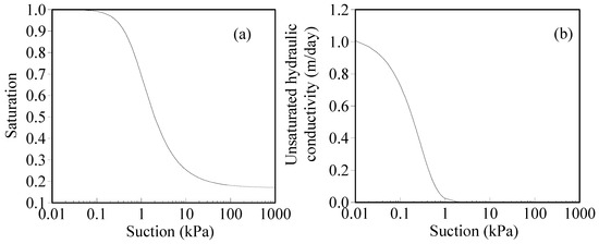 The unsaturated hydraulic conductivity () is the multiplication of the hydraulic conductivity at the fully saturated state () by the relative hydraulic conductivity at the unsaturated state (), as shown in Equation (2). Mualem-van Genuchten [21] proposed the model, shown in Equation (3), for the relative hydraulic conductivity based on the corresponding SWCC.