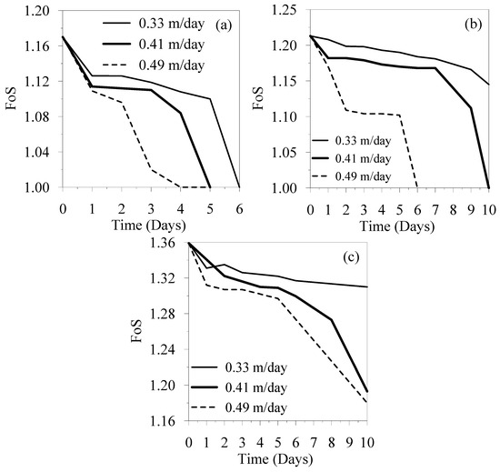Temporal variation in FoS for SR1 slope for a rainfall intensity of (a) 330 mm/day, (b) 410 mm/day, and (c) 490 mm/day.