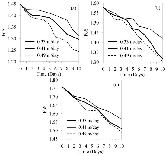 Temporal variation in FoS for SR2 slope for rainfall intensity of (a) 330 mm/day, (b) 410 mm/day, and (c) 490 mm/day.