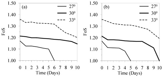 Figure 7a–c show the variation in FoS with time for friction angles 27°, 30°, and 33°. The figure shows that the FoS decreases with time for all three rainfall intensities but with different gradients. The slope with a friction angle of 27° failed at the end of four, five, and six days for the rainfall intensities of 490 mm/day, 410 mm/day, and 330 mm/day, respectively, as seen in Figure 7a. The slope with a friction angle of 30° failed at the end of six and ten days for intensities of 490 mm/day and 410 mm/day, respectively, and the slope did not fail for the lowest intensity of 330 mm/day, as seen in Figure 7b. From the figure, it was observed that the slope with a 33° friction angle did not fail during the rainfall event.