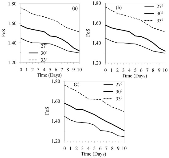 Temporal variation in FoS for SR2 slope with friction angle (a) 27°, (b) 30°, and (c) 33°.