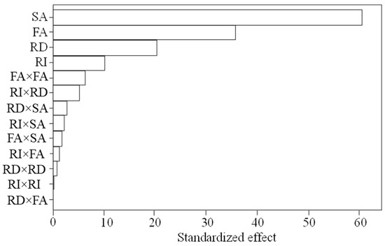 To assess the significance of each variable, a standardized Pareto chart was generated (Figure 11). This chart highlights the dominant effects of slope angle (61%) and friction angle (36%) on the response, while rainfall intensity and duration showed relatively lower influence. The Pareto chart was derived to show the impact of each variable considered in this study. Regarding the effect of individual random variables, it is clear that SA has the strongest influence on FoS (61). The next influential variable is the FA, which shows almost ¾th impact (36) compared to SA. The RI has the least influence on slope stability compared to the other random variables. The quadratic relation of FA and RD showed the least impact on the FoS.
