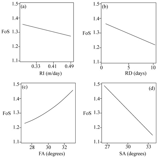 The influence of each random variable on FoS is shown in Figure 12. From the figure, the impacts of RI, RD, and SA on FoS are linear, while FA is nonlinear. It is also observed that the FoS decreases with RI, RD, and SA while it increases with FA.