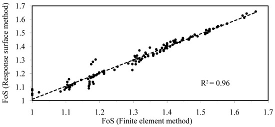 Comparison of the Factor of Safety (FoS) values predicted using the response surface method (Equation (4)) and those computed from finite element simulations.