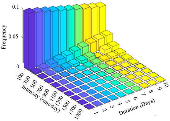 The daily rainfall data from 1979 to 2020 for 3812 stations in the US was obtained from Global Historical Climatology Network Daily (GHCNd). The relative frequency of intensity and duration were obtained from this rainfall data, as shown in Figure 14. The results show that the frequency of the lowest rainfall intensity (200 mm/day) with the shortest duration (1 day) was higher than the other rainfall intensity and duration combinations. The lowest frequency was obtained for the higher intensity (2000 mm/day) and most prolonged duration (10 days). Therefore, this study adopts the bivariate distribution of intensity and duration to calibrate the uncertainty performance with daily rainfall events.