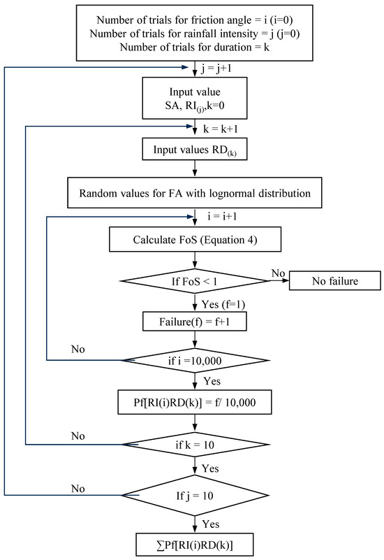 The probability of failure for rainfall-induced slope instability was estimated by calculating the number of failures using Equation (4), where FoS falls below 1 for different rainfall intensity, duration, and friction angles. The probability of failure was obtained separately for both slope ratios. Figure 16 shows the procedure adopted for calculating the probability of failure.