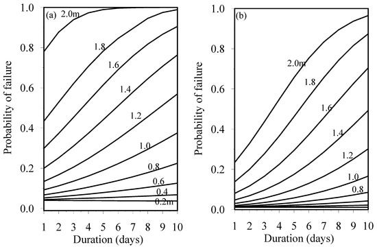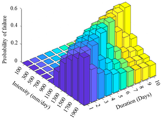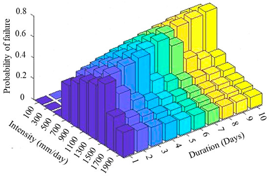 Figure 17a,b show the calculated probability of failure for each intensity and duration for SR1 and SR2 at randomly selected friction angle values using MCS. Figure 18 shows that the probability of failure for intensity 2000 mm/day was higher than the other intensities. The lowest failure probability of failure, 0.037, was obtained for the intensity of 200 mm/day.