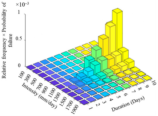 The values of the probability of failure multiplied by the relative frequency for rainfall intensity and duration (as expressed in Figure 14) for SR1 and SR2 are shown in Figure 20 and Figure 21, respectively. The total probability of failure was calculated by summation of the conditional probability of failure multiplied by the relative frequency for rainfall intensity and duration, as shown in Equation (6). The total probability of failure for the SR1 and SR2 slopes are 0.0633 and 0.0249, respectively.