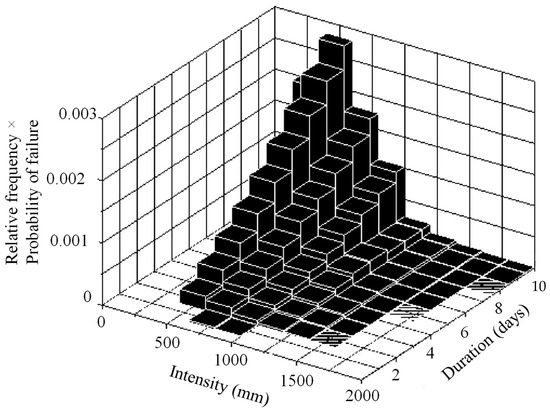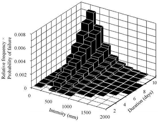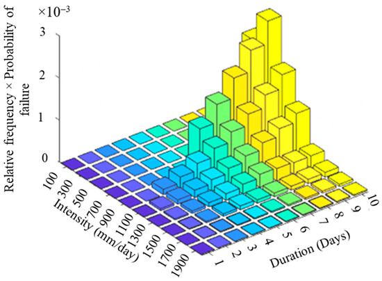 Following a similar procedure, the probability of failure for the given combination of rainfall intensity and duration can be obtained using the response surface shown in Equation (4). The values of the probability of failure multiplied by the relative frequency for rainfall intensity and duration (as expressed in Figure 14) for SR1 and SR2 are shown in Figure 22 and Figure 23, respectively. Finally, the total probability of failure was evaluated using Equation (6), and the total probability of failure for the SR1 and SR2 slopes using FORM are 0.0640 and 0.0229, respectively.