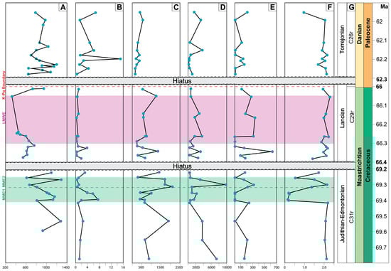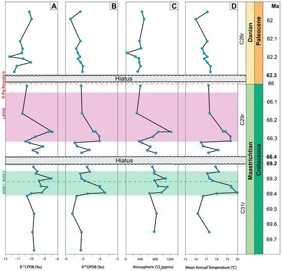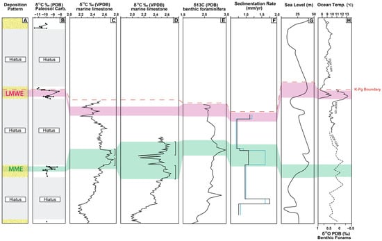 The history of Earth’s climate can be characterized as recurrent short-duration climate excursions occurring throughout long-term climate trends [1,2,3]. The Latest Cretaceous Maastrichtian Stage exemplifies this environmental pattern as it was a time dominated by a long-term cooling trend [4,5] punctuated by four temporally distinct perturbations to global climate (Figure 1A). The best known of these short-term events occurred at the Cretaceous–Paleogene (K-Pg) boundary and was driven by a bolide impact that created environmental conditions unsuitable for 75% of Earth’s species [6,7,8,9,10]. Three earlier Maastrichtian climate events are known by their biotic disruptions and perturbations to the carbon cycle [11,12]. The oldest of these events was the Campanian–Maastrichtian boundary event that exhibits a distinct negative carbon isotope excursion and is known primarily from the marine carbonate record [13,14,15]. The other two Maastrichtian climate events, which are the focus of this study, are the Mid-Maastrichtian Event (MME) and the Late Maastrichtian Warming Event (LMWE) [11,12,16,17,18,19].