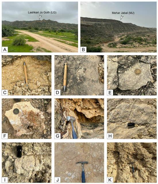 The studied sections (Figure 1), part of a major structure extending N-S from Mehar and Mol Jabals to Cape Monze, display significant folds and faults, such as the Sona Fault, a left-lateral strike-slip fault with 2200 m of offset located along Sona Pass [,]. The Sona Pass and Allah Bano structures are separated by a dextral strike-slip fault with a displacement of about 5 to 7 km. The sedimentary succession of the study area includes shallow marine Eocene to Holocene deposits, with the Oligocene–Miocene units dominating []. The Eocene Kirthar Formation, widely exposed in the southern part of the basin, mainly consists of dark grey to golden-brown bedded fossiliferous limestones []. The overlying Nari Formation consists of fossiliferous limestones and sandstones, divided into the lower Tobo Member and the upper Machani Member []. The latter includes distinct units such as (1) the Pir Mangho Limestone, (2) the Halkani Sandstone, (3) the Ghora Laki Limestone, and (4) the Orangi Sandstone, in stratigraphic order. The upper Nari Formation has been ascribed to a time interval comprised between the Oligocene and the Earlyearly Miocene [,]. The unconformable transition to the overlying Gaj Formation reflects a shift from shallow to slightly deeper marine conditions []. The Gaj Formation is divided into the lower Mol Member and the upper Sharji Member. The Mol Member is further divided into three units: (1) Metan Clay Unit, which consists of greyish- brown and brownish-khaki, thin-bedded clays, intercalated with thin beds of fossiliferous limestones; (2) Jhill Limestone Unit, which consists of light brown to cream-colored, thin-bedded, massive, and nodular limestones; (3) Talawa Limestone, which is a brown to golden/greyish-brown, thin-to-thick-bedded, foraminiferal limestone. The upper member of the Gaj Formation, the Sharji Member, is mainly composed of multicolored shales, locally interbedded with limestones and sandstones [,].