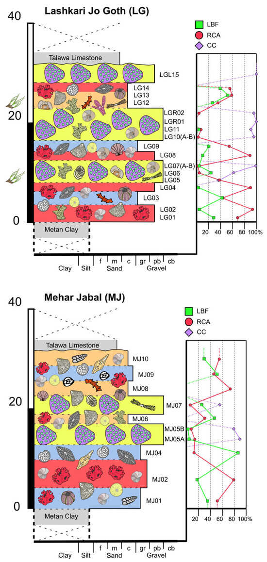 Stratigraphic logs of LG (top) and MJ (bottom) sections, showing the biofacies and the skeletal components recognized in the field and laboratory analyses. The abundances of large benthic foraminifera (LBF; green squares), red calcareous algae (RCA; red circles), and reef corals (CC; violet rhombus) in each sample, derived from the point-counting, are reported on the right side of the logs. Seagrass-related facies are marked by a large seagrass symbol on the side of the log. The key to the symbols is the same as for Figure 3.