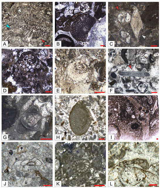 Benthic foraminifera of the Jhill Limestone Unit. (A) Spiroclypeus (white arrow), Nephrolepidina (red arrow), and Operculina (blue arrow). (B) Nephrolepidina cf. praemarginata equatorial section. (C) Amphistegina (white arrow), bryozoan (red arrow). (D) Miogypsina equatorial section, single long spire. (E) Miogypsinoides cf. bantamensis, equatorial section, single short spire. (F) Sorites (red arrow). (G) Austrotrillina. (H) Archaias. (I) Eulepidina. (J) Lobatula. (K) Peneroplis. (L) Planorbulina, curved morphology. Scale bar 100 µm.