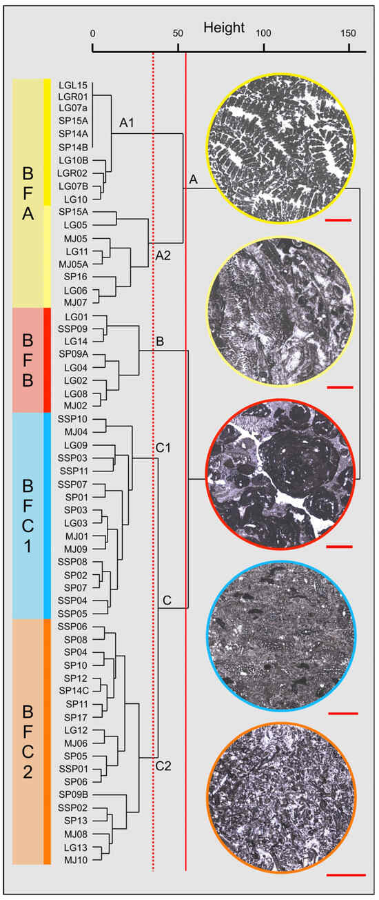Dendrogram resulting from the Q-mode cluster analysis on the point-counting dataset, and interpretation of the different biofacies related to the different clusters. The straight red line separates 3 clusters (A, B, C) at around 65% of similarity (height value = 55); the dotted red line separates 5 clusters (A1, A2, B, C1, C2) at around 75% of similarity (height value = 35). Cluster A1 and A2 constitute the biofacies BFA; cluster B the biofacies BFB; cluster C the biofacies BFC, where the sub-cluster C1 is interpreted as the sub-biofacies BFC1 and the cluster BFC2 as the sub-biofacies BFC2. On the right: microscope images related to the different biofacies (and clusters); the colors of the circular borders follow the colors of the bar on the left. Scale bar 2 mm.