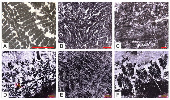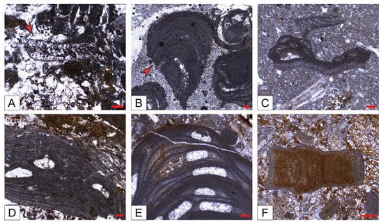 Calcareous algae. (A) Halimeda (red arrow). (B) Sporolithales (red arrow). (C) Mesophyllum, Hapalidiales. (D) Corallinales. (E) Hapalidiales. (F) Articulated coralline alga. Scale bar 100 µm.