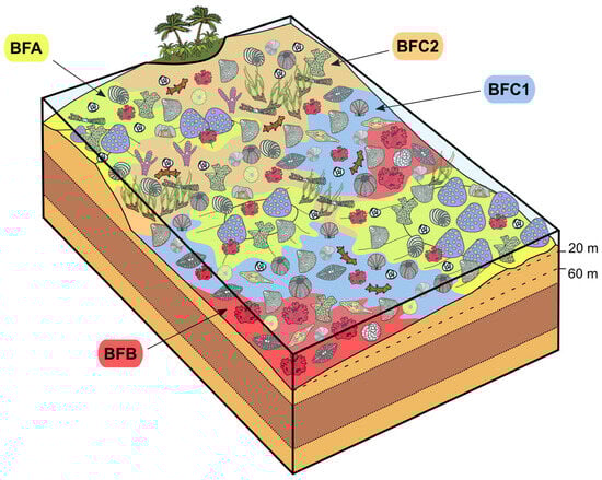BFC is dominated by hyaline LBF and RCA and has been further subdivided based on the type of LBF. The skeletal assemblage of BFC1 is characterized by the abundance of encrusting RCA, miogypsinids, flat and thin hyaline LBF, and lepidocyclinids, with common occurrences of mollusks, bryozoans, and echinoderms, with the most abundant group of LBF being represented by miogypsinids. The latter, similar to present-day calcarinids, are commonly reported to live preferentially in shallow-water marine environments (e.g., []). Lepidocyclinids, on the other hand, were more widespread in middle-to-outer ramp settings, usually below 40 m water depth (e.g., [,,,]). Flat and thin hyaline LBF can occur in a wide variety of settings but usually dominate in the lower part of the photic zone. Given the relative dominance of miogypsinids, together with the rare presence of GCA, geniculate RCA, porcelaneous LBF, and SBF, BFC1 most likely deposited between 30 and 50 m of water depth. BFC2, differently from BFC1, is characterized by a higher abundance of porcelaneous foraminifera, articulated RCA, and GCA, pointing toward shallower settings. Furthermore, BFC2 displays several IPSIs (Indirect Palaeo-Seagrass Indicators; []). These include encrusting RCA and encrusting benthic foraminifera showing hooked morphology; the presence of curve-shaped planorbulinids (Planorbulina sp., Planorbulinella sp.) (Figure 6L) and other morphotype A* foraminifera (sensu []); the presence of several hyaline SBF genera typically associated with seagrass meadows, like Cibicididae (Lobatula sp., Cibicides sp.), keeled Elphidium, and rosalinids []; the presence of soritids and peneroplids, which are typically epiphytic taxa [,]. The presence of other sessile taxa such as victoriellids is also considered another possible proxy for paleo-seagrass-related environment [], together with some sedimentological observations, such as the poor selection and the packstone/rudstone texture of the deposits. Therefore, this biofacies is likely slightly shallower than BFC1 and probably comprised between 20 and 40 m of water depth.