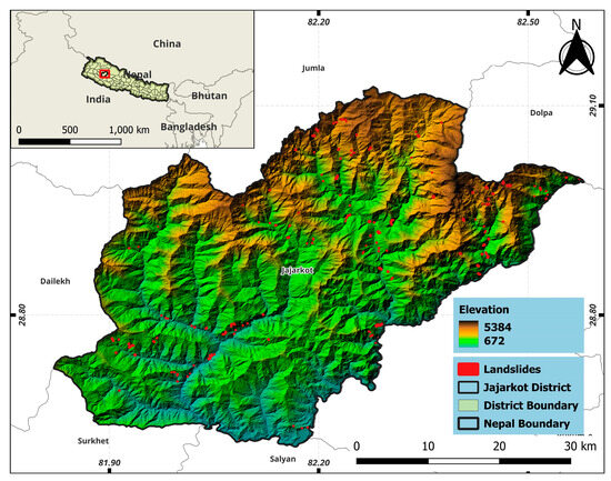 Location of the study area (Jajarkot District) draped over the elevation and landslide polygons.