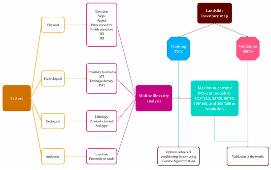 At the same time, the complexity of incorporating numerous landforms and spatial information poses challenges in achieving data and methodological consistency [31]. Furthermore, a standardized framework for selecting these factors is lacking, and often relies on users’ experience and experts’ opinions for guidance [15,32]. In this paucity of specific approaches to the selection of conditioning factors for landslides, the genetic algorithm (GA) can be implemented to identify the optimal combination of landslide conditioning factors [33,34,35,36]. The GA has been used extensively in factor optimization and to identify the most suitable subset of conditioning factors [27]. Along with the selection of conditioning factors, the resolution of data used also plays a crucial role in the accuracy and reliability of landslide susceptibility mapping [35,37,38].