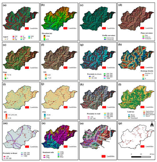 Maps of CFs: (a) aspect, (b) elevation, (c) profile curvature, (d) plane curvature, (e) slope, (f) TPI, (g) proximity to rivers, (h) drainage density, (i) SPI, (j) TWI, (k) proximity to roads, (l) land use, (m) proximity to thrust, (n) dominant soil (o) lithology, and (p) landslide inventory.
