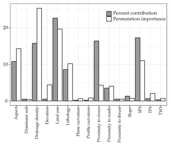The result of factor importance, in terms of percent contribution and permutation importance (Figure 5), greatly impacts the preparation of a susceptibility map [41,59]. Among the CFs, land use demonstrated the highest percentage contribution, with a value of 22.7%, indicating its strong influence on landslide susceptibility. Other selected CFs, such as slope, TPI, dominant soil, proximity to thrust, and elevation, exhibited lower percent contributions, ranging between 0.2% and 3.5% (Figure 5).
