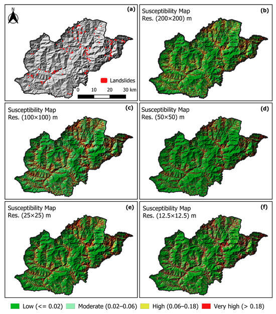 Landslide susceptibility maps at different resolutions (a) landslides over hill shade, (b) susceptibility map at 200 × 200 m resolution, (c) susceptibility map at 100 × 100 m resolution, (d) susceptibility map at 50 × 50 m resolution, (e) susceptibility map at 25 × 25 m resolution, and (f) susceptibility map at 12.5 × 12.5 m resolution.