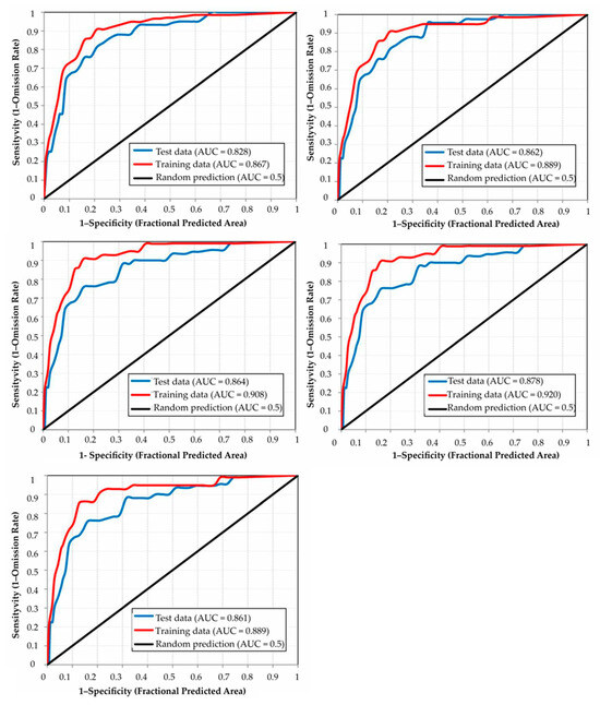 Validation of each susceptibility map (Figure 6) at different resolutions was assessed to identify the best performing resolution of the datasets using ROC curve analysis [10,39]. At a resolution of 12.5 m, the model reached a training and test AUC of 0.867 and 0.828, respectively. Increasing the resolution to 25 m resulted in improved performance, with a training and test AUC of 0.889 and 0.862, respectively (Figure 7). This enhancement trend continued as the resolution increased to 50 m, yielding a training and test AUC of 0.908 and 0.864, respectively. At a resolution of 100 m, the model further improved, reaching a training and test AUC of 0.920 and 0.878, respectively.
