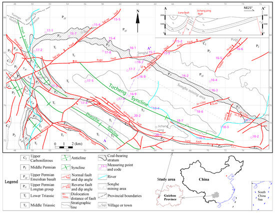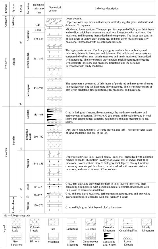 The study area, the Tucheng syncline, is located in the northeast of Panzhou City, Guizhou Province, 35 km away from Panzhou City in a straight line. The study area is a short-axis syncline, stretching approximately 30 km in length along its major axis and 8 km along its minor axis. The area, demarcated by the outcrop line of the coal-bearing strata at its base, spans approximately 200 km2. The study area is characterized by plateau middle mountains and a karst–tectonic terrain. Its surface elevation ranges from 1500 to 2000 m. In the study area, the strata, from oldest to newest, include the Upper Carboniferous, Permian, Lower–Middle Triassic, and Quaternary (Figure 1 and Figure 2). Quaternary sediments are very scarce and are only sporadically distributed along the river in the study area. The Quaternary is not depicted in Figure 1 because it cannot be conveniently shown in plan view. The Upper Permian Longtan Formation (P3l) is a coal-bearing formation within the area. This formation typically holds over 50 coal layers, with 32 of them being designated as numbered coal seams. Some very thin and unstable coal seams are not numbered. Out of these, 14 coal seams across the mine field are either mineable or mostly mineable. The total thickness of the coal seams is 20.53 m. The main type of coal is coking coal.