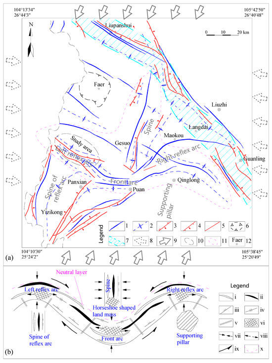 On a broader spatial scale, the Liupanshui–Qinglong–Panzhou region exhibits a prominent “山”-shaped structural pattern. This structural system, conceptualized by the renowned Chinese geologist Siguang Li [31], derives its name from its resemblance to the Chinese character for “山” (mountain). It comprises five distinct components: a front arc, a reflex arc, a central spine, a horseshoe-shaped shield landmass, and a supporting reflex arc spine (or pillar) (Figure 3). The “山”-shaped structure’s mechanical mechanism is widely attributed to the bending effect of the crossbeam, with two pillars (or reflex arc spines) serving as its two fulcrums. When a compressive force acts perpendicularly on the crossbeam, the pillar sections undergo a reflex arc bending deformation. Between the two pillars, a front arc bending deformation forms. The front arc lies on the outer side of the “neutral layer” where the crossbeam bends, experiencing lateral tension at its top. The spine, on the contrary, is positioned on the inner side of the “neutral layer,” where it undergoes lateral compression as the crossbeam bends. Meanwhile, the horseshoe-shaped land mass is situated in the stress buffer zone adjacent to the “neutral layer,” collectively forming the essential elements of the “山”-shaped structure.