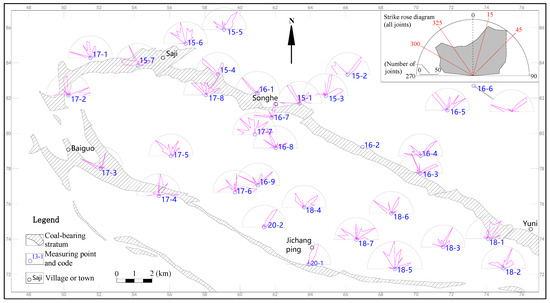 A geological field survey was conducted on the Tucheng syncline, covering a field work area of approximately 255 km2. The investigation encompassed its structural features, outcrop lithology, and joint measurements. A total of 33 outcrops were observed, yielding 32 valid data points. At each observation point, a minimum of 50 joints were measured, resulting in a cumulative total of 1893 joints measured across the entire survey area. The predominant orientation of the joint strikes was determined for each observation point. Statistical analysis indicated that the primary joint strikes in the study area were approximately NNE–NE (15–45°) and NW (300–325°) (Figure 4). A total of 807 joints fell within these two intervals, representing 42.6% of the total joint count. Furthermore, the dip angles of the joints in the study area were generally steep, with 76.2% of the joints having a dip angle of 65° or greater.