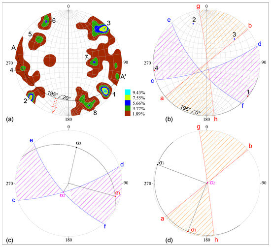 Joints are widely developed in strata that have undergone tectonic deformation. Reconstructing paleotectonic stress fields using conjugate shear joint systems is a traditional and effective method in structural geology. Typically, a sufficient number of joint orientations are measured at outcrops, and a joint density diagram is plotted to identify several high-density points. These high-density points correspond to the normals of joint planes that are particularly well developed in certain orientations and are referred to as predominant joints (Figure 5a). Since initial conjugate joints form in horizontal strata, subsequent tectonic movements often cause strata to tilt or fold, altering the original orientations of conjugate joints. Therefore, in stereographic projection analysis, strata must be restored to their original horizontal state to accurately determine the initial conjugate joint orientations. In the example provided, restoring the strata to a horizontal state reveals that high-density points 1, 2, 3, and 4 (corresponding to the joint plane arcs , , , and , respectively) can be matched. Specifically, high-density points 1 and 4 represent a pair of conjugate joints ( and ), while points 2 and 3 represent another pair ( and ) (Figure 5b). Based on a tectonic evolution analysis of the study area, it was confirmed that the conjugate joints and were formed during the first stage of tectonic deformation, while and were formed during the second stage. This allowed for the determination of the maximum, intermediate, and minimum principal stress orientations for the first and second stages of the tectonic stress field (Figure 5c,d).