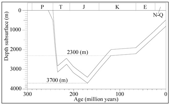 Burial history of the Upper Permian coal seams in the adjacent area (Panguan syncline), simplified and modified from reference [36].