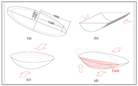 Geometric models of different tectonic deformation stages in the study area. (a) The present-day projection ellipse of coal-bearing strata; (b) the structural form of the first deformation stage; (c) the structural form of the second deformation stage; (d) the structural form of the third deformation stage.