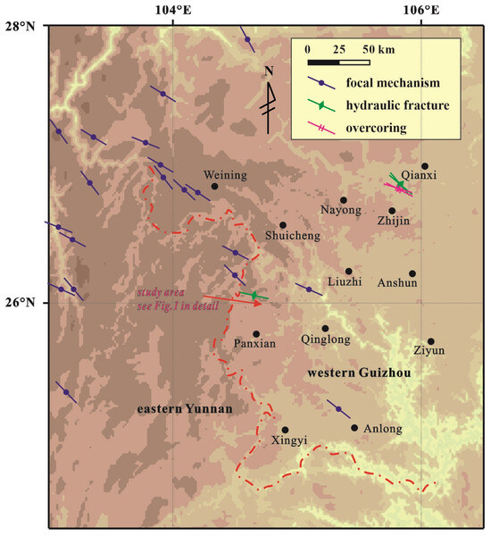 The driving forces of the present-day stress field in eastern China primarily result from the westward subduction of the Pacific Plate beneath the Eurasian continent and the northwestward subduction of the Philippine Plate toward Eurasia. This combined effect causes the dominant orientation of the maximum horizontal principal stress in western Guizhou to align along a distinct NW–SE direction. However, in the vicinity of the study area, the orientation shifts to NWW–SEE (Figure 8).