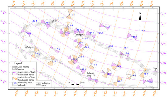 First Stage (Early Yanshanian period): The tectonic stress field exhibited maximum principal stress traces oriented NWW–SEE. In the western part of the study area, the maximum principal stress axis deviated slightly toward the NW direction.