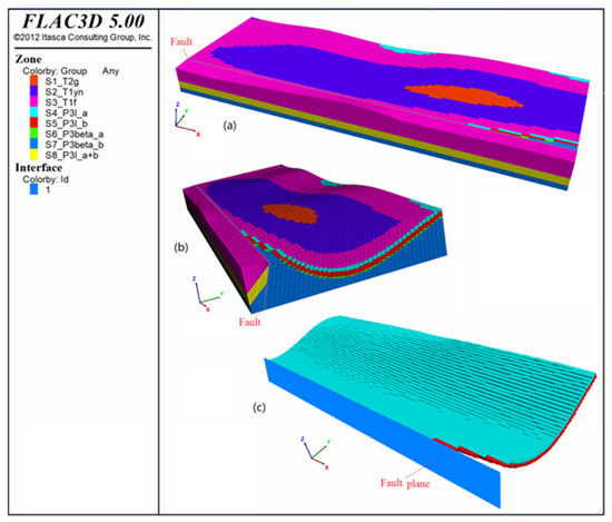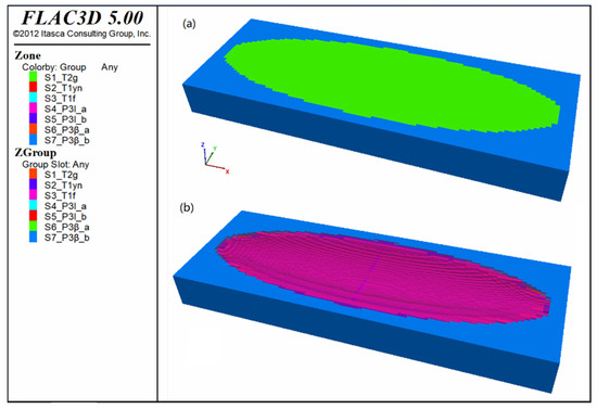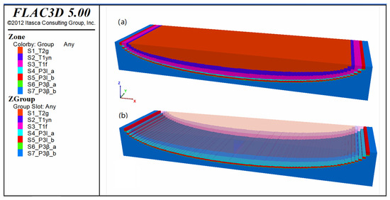 Numerical simulations were conducted using the Flac3D software. After the first stage of horizontal compression, the strata in the study area deformed into a near-semicylindrical fold with an upright axial plane and horizontal hinge. A cylindrical surface equation was derived based on the dimensions of the cylindrical model. The Fish language was used for programming to identify and establish different “rock stratum groups” during modeling (Figure 11a). The model consisted of 90 × 40 × 90 units along the x-, y-, and z-axes, totaling 324,000 units. Using the cylindrical surface equation, the internal rock stratum groups were outlined with regular shapes, meeting the simulation requirements, such as the upper Longtan Formation (P3l_a, Figure 11b).