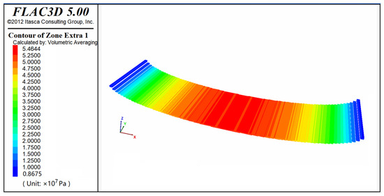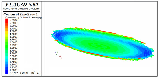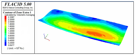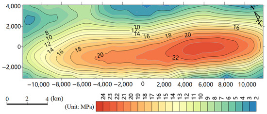 In this model, velocity constraints were applied along the y-axis, with full constraints at the base. Loading was applied along the x-axis, with a basal load of 80 MPa and a stress gradient of 0.015 MPa/m (due to a lack of paleostress gradient data, the present-day stress gradient was used). An elastic mechanics model was employed, with the maximum unbalanced force ratio (computational precision) set to the default value of 1 × 10−5. Upon completing the calculation, the differential stress (σ1 − σ3) was used to visualize the stress state of the target layer (P3l_a). The results showed that the maximum differential stress in the target layer was approximately 54.64 MPa. Stress was concentrated in the central region of the cylindrical surface, with differential stress gradually decreasing symmetrically toward both sides (Figure 12).