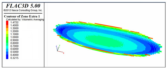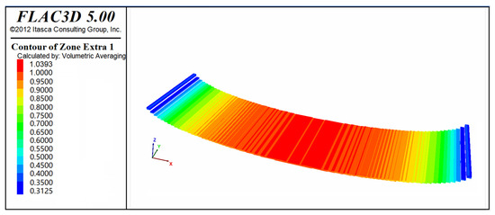 Fish is an embedded programming language in the Flac3D 5.00 software, which has good flexibility and a simple syntax. The types of rock stratum groups and the formula for the elliptic-cylindrical surface were defined through the Fish language. Then, all units of the model were traversed by pointers to identify and create the desired multiple rock stratum groups. In this way, a model with an elliptic-cylindrical shape consisting of multiple rock stratum groups was created (Appendix A.1).