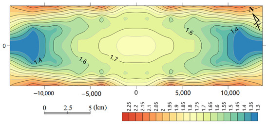 The Tucheng syncline currently exhibits a short-axis synclinal shape approximating a semi-ellipsoidal structure. The projection of the coal-bearing strata (P3l) forms an ellipse, with a long semi-axis of 12,000–14,000 m and a short semi-axis of 3700–4300 m (Figure 7a). The outer ellipse represents the projection of the P3l’s basal surface, which was estimated and reconstructed based on its dimensions. The current maximum burial depth of the P3l’s basal surface is approximately 2300 m. Considering the deformation characteristics (with Poisson’s ratio set to 0.25), the profile was restored to its maximum burial depth of 3700 m, and the reconstruction process yielded the following results: