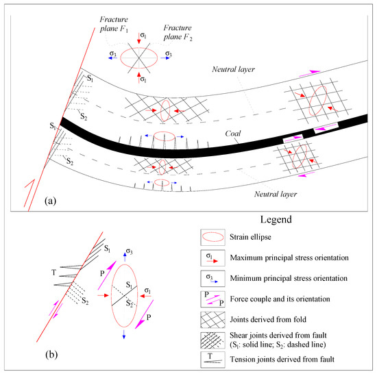 The fundamental cause of rock (including coal) fracturing is stress-induced failure, with the direct cause of structural fractures being multi-stage tectonic deformation during tectonic evolution. Joints, as typical structural fractures, are closely associated with the paleotectonic stress field. Geologists can analyze and statistically evaluate joints using stereographic projection diagrams to determine the orientations of the maximum (σ1), intermediate (σ2), and minimum (σ3) principal stress axes of conjugate shear joints. The principal stress orientations obtained from multiple observation points enable the reconstruction of the tectonic stress field in the study area [35].