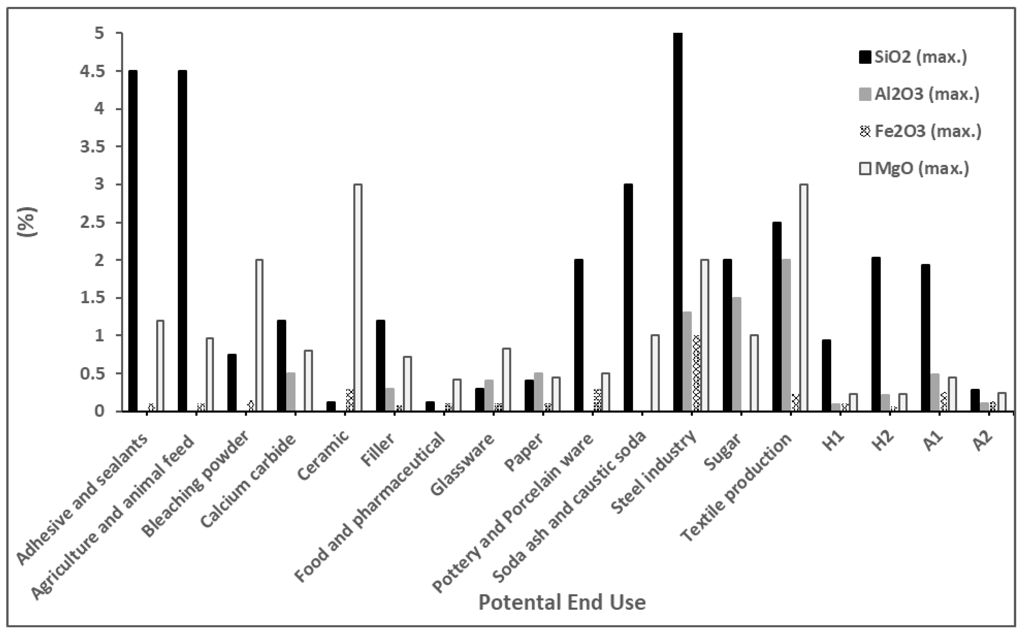Figure 11). Generally, all investigated limestones were found to be suitable for use in the pottery and porcelain ware, soda ash and caustic soda, steel industry, sugar, and textile production industries. On the other hand, limestone from the Ajlun ASL upper bed was the only one suitable for use in the bleaching powder and calcium carbide industries.
