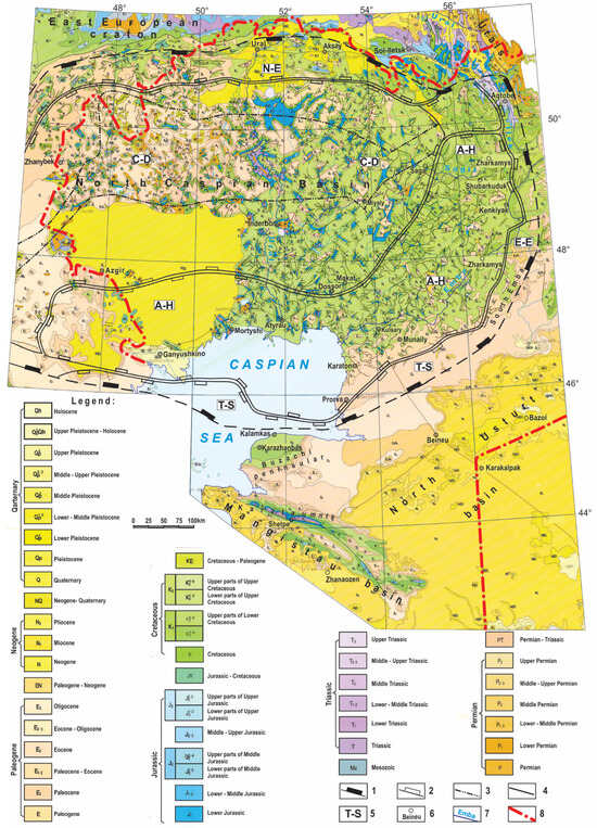 Geological sketch map of the North Caspian Basin and adjacent territories (modified after [2]). Legend: 1—contours of the North Caspian Basin; 2—contours of the main structural elements; 3—A-H: Astrakhan–Aktobe system of uplifts; T-S—Tugarakchan sag; E-E—eastern edge zone; N-E—northern edge zone; 4—C-D: Central Caspian depression; 5—letter designations of allocated zones; 6—settlements; 7—rivers; 8—state border of the Republic of Kazakhstan.