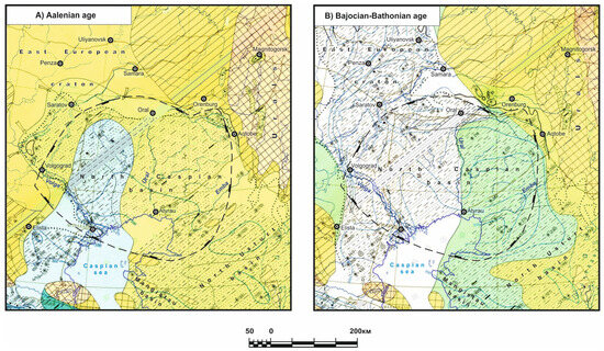 Middle Jurassic—Aalenian Age: In the Aalenian, the accumulation areas at the East European craton expanded somewhat, although most of the platform still represented a hilly denudation plain. The southwestern territories were separated from the North Caspian Basin via the Voronezh–Stavropol lowland denudation plain; in certain locations, it was hilly, and numerous rivers carried terrigenous material into adjacent basins (Figure 6A).