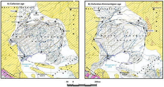 Paleogeographic reconstruction of the North Caspian Basin of the Late Jurassic epoch, Callovian age (A), and Oxfordian–Kimmeridgian age (B) (modified after [22,23,24]).